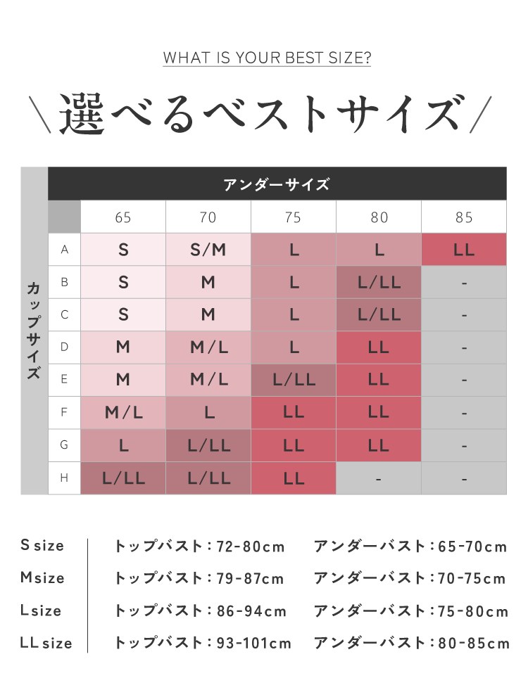 どちらがいいなど決め方はありますか?Aトップバストのヌード寸法で、サイズをお選びください。背中とアンダー部分は着圧力のある設計となっております。